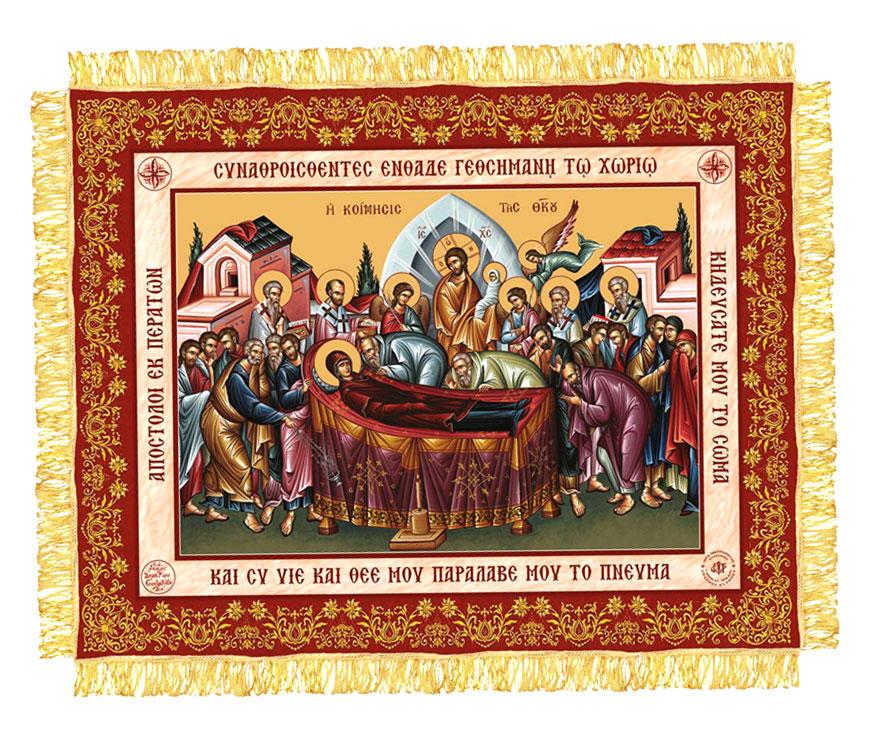Η Ιερά Μονή Αγίας Τριάδος Σπαρμου Ολύμπου προσφέρει στους ιερούς ναούς μια οικονομική επιλογή Επιταφίου της Παναγίας! Πρόκειται για ευκρινή αποτύπωση σε ύφασμα, αγιογραφίας της Κοιμήσεως της Θεοτόκου, εξαιρετικής τέχνης. Περικλείεται από καλαίσθητο χρυσοκέντημα σε βελούδο.